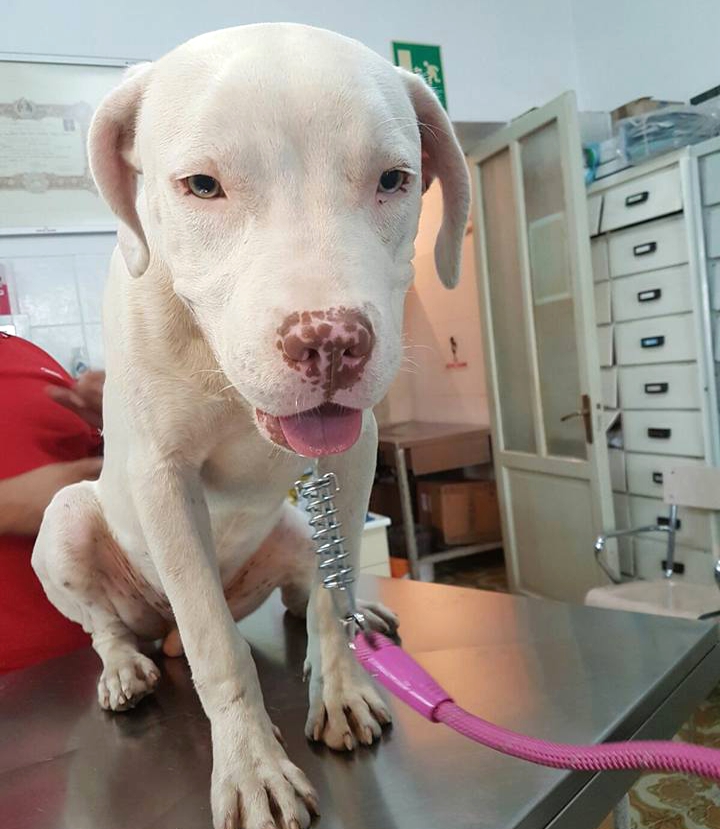 19/07/2016: Jago è stato portato dal veterinario, le ferite sono state pulite in profondità, dato antibiotico, sverminato, richiesto vari esami di cui avremo a breve i risultati. Per non farci mancare niente ha anche un'ernia ombelicale per cui dovrà essere operato dopo che sarà castrato. Ha circa 7 mesi, probabile incrocio pitbull/dogo, crediamo che non avrà difficoltà a trovare casa, ma lo affideremo (una volta curato) solo a chi ha già pregressa esperienza della razza e a chi lo tratterà come un principino.